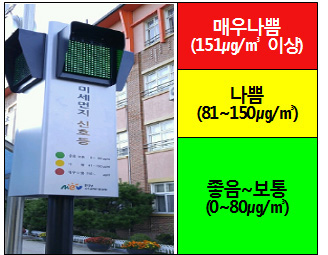 ¹Ì¼¼¸ÕÁö ½ÅÈ£µîÀº ¹Ì¼¼¸ÕÁö ³óµµ¸¦ ¼öÄ¡·Î Ç¥ÇöÇÏ´Â ´ë½Å¿¡ ¾î¸°À̰¡ ÀÌÇØÇϱ⠽±µµ·Ï ÃÊ·Ï(80§¶/§© ÀÌÇÏ), ³ë¶û(81~150§¶/§©), »¡°»ö(151§¶/§© ÀÌ»ó)À¸·Î Ç¥ÇöÇÑ´Ù.