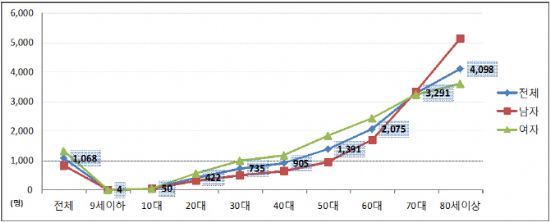 Áö³ 2016³â ±âÁØ ¿¬·É´ëº° Àüü Áø·á ÇöȲÀ» »ìÆìº¸¸é 50´ë°¡ 11¸¸4777¸í(21.2%)À¸·Î °¡Àå ¸¹¾Ò´Ù. À̾î 60´ë(19.9%), 70´ë(18.2%) ¼øÀ¸·Î Áø·á ÀοøÀÌ ¸¹¾Ò´Ù. ºÒ¸éÁõ Àüü Áø·á Àοø 10¸í Áß ¾à 6¸íÀÌ 50~70´ë¿´´Ù. ³²ÀÚ´Â 70´ë¿¡¼ 4¸¸4114¸í(21.1%)À¸·Î °¡Àå ¸¹¾Ò°í, ¿©ÀÚ´Â 50´ë¿¡¼ 7¸¸5047¸í(22.6%)À¸·Î °¡Àå ¸¹¾Ò´Ù.