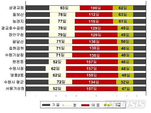 ȯ°æºÎ ¼Ò¼Ó ±¹¸³È¯°æ°úÇпøÀº 2016³â 6¿ùºÎÅÍ Áö³ÇØ 5¿ù±îÁö ¼ö¿ø½Ã ¼ÒÀç 11°³ Áö¿ª¿¡¼ ÃøÁ¤µÈ ±â»óÀڷḦ Åä´ë·Î º½, ¿©¸§, °¡À», °Ü¿ïÀÇ ½ÃÀÛÀϰú ±â°£À» ºÐ¼®ÇÏ°í °¢ ÃøÁ¤Áö¿ª ¹Ý°æ 500m ³» ±×¸°ÀÎÇÁ¶ó ¹× ±×·¹ÀÌÀÎÇÁ¶ó ºñÀ²À» Á¶»çÇß´Ù°í 13ÀÏ ¹àÇû´Ù.