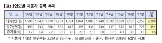 15ÀÏ ±¹Åä±³ÅëºÎ°¡ ¿î¿µÇϰí ÀÖ´Â ÀÚµ¿Â÷°ü¸®Á¤º¸½Ã½ºÅÛ(VMIS)¿¡ µû¸£¸é 6¿ù ¸» ±âÁØ ±¹³» ÀÚµ¿Â÷ ´©Àû µî·Ï´ë¼ö´Â 2288¸¸2035´ë·Î À۳⠸»¿¡ ºñÇØ ¾à 1.6% Áõ°¡Çß´Ù. Àα¸(6¿ù ±âÁØ Àα¸¼ö 5180¸¸1000¸í) 2.3¸í´ç ÀÚµ¿Â÷ 1´ë¸¦ º¸À¯Çϰí ÀÖ´Â ¼ÀÀÌ´Ù.