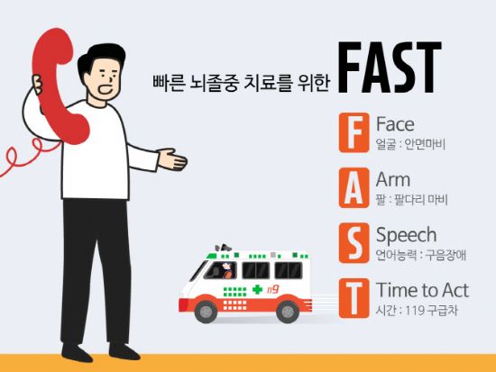 ´õºÒ¾î ³úÁ¹ÁßÀÇ Á¶±â Áõ»óÀÌ ³ªÅ¸³µÀ» °æ¿ì ½Å¼ÓÈ÷ º´¿øÀ» ã´Â °Íµµ Áß¿äÇÏ´Ù. ³úÁ¹ÁßÀÇ ÁÖ¿äÁõ»óÀ» ÀÎÁöÇϰí Á¶Ä¡ÇÏ´Â ¹æ¹ýÀ¸·Î´Â FAST °Ë»ç¸¦ Ȱ¿ëÇÏ¸é µÈ´Ù. FAST´Â ¾ó±¼(Face), ÆÈ(Arms), ¾ð¾î(Speech), ½Ã°£(Time to act)ÀÇ ÁÙÀÓ¸»·Î, ¾ó±¼À̳ª »çÁö¿¡ ¸¶ºñ°¡ ¿À°Å³ª ȤÀº ¸»ÀÌ ¾î´ÇØÁú °æ¿ì ÁöüÇÏÁö ¸»°í º´¿ø¿¡ °¡¾ß ÇÑ´Ù´Â ¶æÀÌ´Ù. ƯÈ÷ ³ú¼¼Æ÷´Â ¸î ºÐ¸¸ Ç÷¾×°ø±ÞÀÌ ¾È µÅµµ ¼Õ»óÀ» ÀÔ´Â ¸¸Å, ÃÖ´ëÇÑ »¡¸® º´¿øÀ» °¡¼ ÀûÀýÇÑ Á¶Ä¡¸¦ ¹Þ¾Æ¾ß »ç¸Á ¹× ÈÄÀ¯ÁõÀ» ¸·À» ¼ö ÀÖ´Ù.