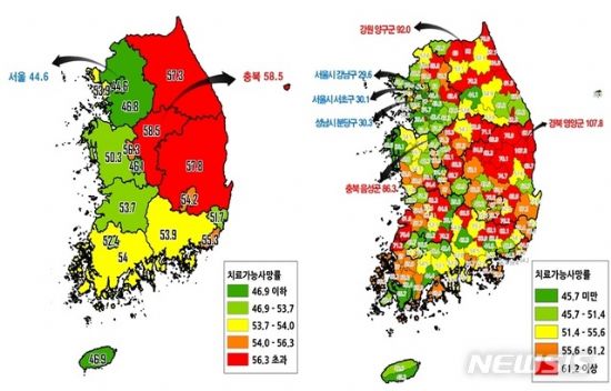 2015³â ±âÁØ Àü±¹ 17°³ ½Ã¡¤µµ °¡¿îµ¥ Àα¸ 10¸¸¸í´ç Ä¡·á °¡´É »ç¸ÁÀÚ¼ö°¡ °¡Àå ³ôÀº °÷Àº 58.5¸íÀ» ±â·ÏÇÑ ÃæºÏÀ̾ú´Ù. ÀÌ´Â °¡Àå ³·Àº ¼¿ï(44.6¸í)º¸´Ù 31% ³ôÀº ¼öÄ¡´Ù. ½Ã¡¤±º¡¤±¸º°·Î´Â °æºÏ ¿µ¾ç±ºÀÌ 107.8¸íÀ¸·Î Àü±¹¿¡¼ °¡Àå ³ô¾Ò´Âµ¥ ÃÖÀúÄ¡ÀÎ ¼¿ï °³²±¸ÀÇ 29.6¸í ´ëºñ 364%¿¡ ´ÞÇÑ´Ù.