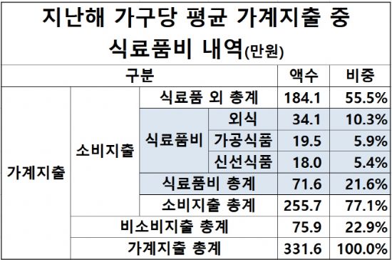 ³ó¸²Ãà»ê½ÄǰºÎ´Â Çѱ¹³óÃ̰æÁ¦¿¬±¸¿ø(³ó°æ¿¬)°ú Åë°èû 2017³â °¡°èµ¿ÇâÁ¶»ç¸¦ Åä´ë·Î °¡±¸ÀÇ ½Ä·áǰºñ(¿Ü½Ä¡¤°¡°ø½Äǰ¡¤½Å¼±½Äǰ) ÁöÃâ ±¸Á¶¸¦ ºÐ¼®ÇÑ °á°ú ÇÑ °¡±¸´Â ¿ùÆò±Õ 331¸¸6000¿øÀ» ¼ÒºñÇϰí ÀÌÁß 21.6%ÀÎ 71¸¸6000¿øÀÌ ½Ä·áǰºñÀÎ °ÍÀ¸·Î Áý°èµÆ´Ù. °¡°èÁöÃâ Áß ¼ÒºñÁöÃâÀÌ 255¸¸7000¿ø, ºñ¼ÒºñÁöÃâÀÌ 75¸¸9000¿øÀ̶õ °É °í·ÁÇÏ¸é ¼ÒºñÁöÃâ Áß ½Ä·áǰºñ ºñÁßÀº ¾à 28.0%´Ù.