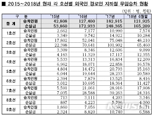 17ÀÏ ¼¿ï½Ã°¡ ±¹Åä±³ÅëºÎ ¼Ò¼Ó ±è»óÈÆ ÀÚÀ¯Çѱ¹´ç ÀÇ¿ø¿¡°Ô Á¦ÃâÇÑ '¿Ü±¹ÀÎ °æ·ÎÀÎ ¹«ÀÓ½ÂÂ÷ ÇöȲ'¿¡ µû¸£¸é ¿Ü±¹ÀÎ °æ·ÎÀÚÀÇ ¼¿ïÁöÇÏö ¹«ÀÓ½ÂÂ÷ ÀοøÀº 2015³â 4¸¸2808¸í, ¼Õ½Ç±ÝÀº 5386¸¸¿øÀÎ °ÍÀ¸·Î ³ªÅ¸³µ´Ù. 3³âÀÌ Áö³ 2017³â¿¡´Â À̿밴 18¸¸2915¸í, ¼Õ½Ç±ÝÀº 2¾ï4836¸¸¿øÀ¸·Î Àοø¼ö´Â 4¹è ÀÌ»ó, ¼Õ½Ç±ÝÀº 5¹è ÀÌ»ó ´Ã¾î³ ¼öÄ¡´Ù.