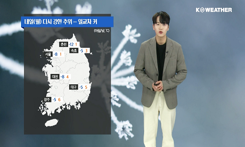 ¿ù¿äÀÏÀÎ ¿À´Ã(3ÀÏ¡¤¿ù) Àü±¹¿¡ ´Ù½Ã °ÇÑ ÃßÀ§°¡ ¿À°Ú´Ù. Çѳ·¿¡´Â ±â¿ÂÀÌ Å©°Ô ¿À¸£¸ç Àϱ³Â÷°¡ Å©°ÚÁö¸¸, ´ëü·Î Á¾ÀÏ Ãß¿î ³¯¾¾¸¦ º¸À̰ڴÙ. ÇÑÆí, °¿ø¿µµ¿°ú ¿µ³²À» Áß½ÉÀ¸·Î´Â °è¼ÓÇØ¼ ´ë±â°¡ °ÇÁ¶Çؼ »êºÒ°ú ÈÀç¿¡ °¢º°È÷ Á¶½ÉÇØ¾ß°Ú´Ù. ¶ÇÇÑ, Áß¼ºÎÁö¿ªÀº ¿ÀÈÄ µé¾î ¸ÕÁö³óµµ°¡ ´Ù¼Ò ³ô¾ÆÁö°Ú´Ù.