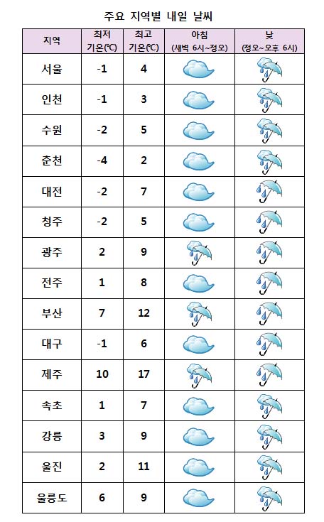 È¿äÀÏÀÎ ³»ÀÏ(16ÀÏ)Àº Àü±¹ ´ëºÎºÐ Áö¹æ¿¡ ´« ¶Ç´Â ºñ°¡ ¿À°Ú°í, ¹Ì¼¼¸ÕÁö ³óµµ°¡ °è¼ÓÇØ¼ ³ô°Ô ³ªÅ¸³¯ Àü¸ÁÀÌ´Ù. ¹Î°£±â»ó±â¾÷ ÄÉÀÌ¿þ´õ´Â ¡°³»ÀÏ ¿ì¸®³ª¶ó´Â Áß±¹ ºÏºÎÁö¹æ¿¡¼ µ¿ÁøÇÏ´Â °í±â¾ÐÀÇ °¡ÀåÀÚ¸®¿¡ µé´Ù°¡ ³²¼ÂÊ¿¡¼ ´Ù°¡¿À´Â ±â¾Ð°ñÀÇ ¿µÇâÀ» ¹Þ°Ú´Ù¡±¸ç ¡°¾ÆÄ§¿¡ Àü³²ÇؾÈ, Á¦ÁÖµµ¿¡¼ ºñ°¡ ¿À±â ½ÃÀÛÇØ ¿ÀÈÄ¿¡ Àü±¹ ´ëºÎºÐ Áö¹æÀ¸·Î È®´ëµÇ°Ú´Ù¡±°í ¿¹º¸Çß´Ù. ÀÌ¾î ¡°ÁߺϺÎÁö¹æÀº ºñ ¶Ç´Â ´«ÀÌ ³»¸®´Ù°¡ ¹ã¿¡ ´ëºÎºÐ ±×Ä¡°Ú°í, ÃæÃ»À̳²Áö¹æÀº ¸ð·¹(17ÀÏ)¿ÀÀü¿¡ ´ëºÎºÐ ±×Ä¡°Ú´Ù¡±°í ÀüÇß´Ù. * ¿¹»ó °¼ö·®(16~17ÀÏ) - ³²ÇؾÈ, Á¦ÁÖµµ : 10~30(¸¹Àº °÷ 50)mm - ÃæÃ»À̳²(³²ÇؾÈÁ¦¿Ü) : 5~20mm - ÁߺϺÎ(16ÀÏ) : 5mm³»¿Ü * ¿¹»óÀû¼³(16~17ÀÏ) - °æ±âµ¿ºÎ, °¿ø¿µ¼(16ÀÏ) : 1~3cm ¾ÆÄ§ ÃÖÀú±â¿ÂÀº -4¡É¿¡¼ 10¡É, ³· ÃÖ°í±â¿ÂÀº 2¡É¿¡¼ 17¡É°¡ µÇ°Ú´Ù. ´çºÐ°£ ±â¿ÂÀº Æò³âº¸´Ù ³ôÀº ºÐÆ÷¸¦ º¸À̰ڴÙ.