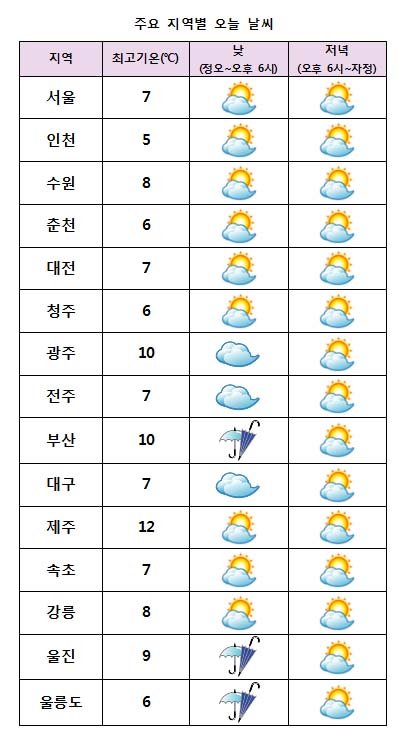 ¿À´Ã ³· ±â¿ÂÀº ¼¿ï¡¤´ëÀü¡¤ÀüÁÖ¡¤´ë±¸ 7¡É, ±¤ÁÖ¡¤ºÎ»ê 10¡É, Á¦ÁÖ 12¡É µî Àü±¹ÀÌ 5~12¡É°¡ µÇ°Ú°í, ´çºÐ°£ ±â¿ÂÀº Æò³âº¸´Ù ³ôÀº ºÐÆ÷¸¦ º¸À̰ڴÙ.
