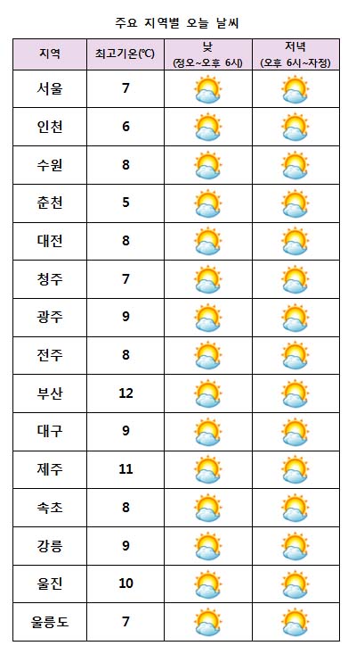 ¿À´Ã ³· ±â¿ÂÀº ¼¿ï¡¤Ã»ÁÖ 7¡É, ´ë±¸¡¤°¸ª 9¡É, ºÎ»ê 12¡É µî Àü±¹ÀÌ 5~12¡ÉÀÇ ºÐÆ÷¸¦ º¸ÀÌ¸ç Æò³âº¸´Ù ³ôÀº ¼öÁØÀÌ µÇ°Ú´Ù.