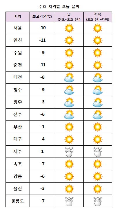 ¿À´Ã ³· ÃÖ°í±â¿ÂÀº ¼¿ï -10¡É, ±¤ÁÖ -3¡É, ºÎ»ê -1¡É µî Àü±¹ÀÌ -11¡É~1¡ÉÀÇ ºÐÆ÷¸¦ º¸À̰ڴÙ.
