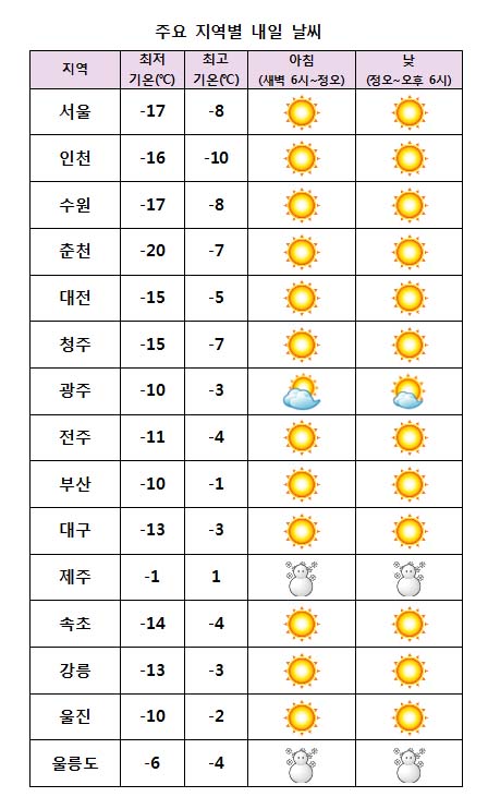 ´çºÐ°£ ¾ÆÄ§ ÃÖÀú±â¿ÂÀº -15¡É ³»¿Ü·Î ¶³¾îÁö´Â °÷ÀÌ ¸¹°Ú°í, ³· ±â¿Âµµ ¿µÇϱÇÀ» º¸À̰ÚÀ¸´Ï ¼öµµ°üµ¿ÆÄ»ç°í¿¹¹æ µî ½Ã¼³¹°°ü¸®¿¡ ÁÖÀǸ¦ ±â¿ïÀÌ´Â °ÍÀÌ ÁÁ°Ú´Ù. ¼¿ï¡¤°æ±â, µ¿ÇؾÈ, °æ»óµµ¿¡ °ÇÁ¶Æ¯º¸°¡ ¹ßÈ¿ ÁßÀÎ °¡¿îµ¥ ´ë±â°¡ ¸Å¿ì °ÇÁ¶ÇϰڴÙ. ±¹³»·Î ûÁ¤ÇÑ °ø±â°¡ À¯ÀÔµÇ°í ´ë±âÀÇ ¼øÈ¯µµ ¿øÈ°ÇØ ¹Ì¼¼¸ÕÁö ³óµµ´Â Àü±¹ÀÌ ¡®ÁÁÀ½¡¯ ´Ü°è¸¦ º¸À̰ڴÙ. ¹Ù´ÙÀÇ ¹°°áÀº 4~5m µ¿ÇØ»ó°ú ¼ÇظչٴÙ, Á¦ÁÖµµ³²Âʸչٴٿ¡ dz¶ûƯº¸°¡ ¹ßÈ¿µÈ °¡¿îµ¥ ´çºÐ°£ ¹Ù¶÷ÀÌ ¸Å¿ì °ÇÏ°Ô ºÒ°í ¹°°áÀÌ ¸Å¿ì ³ô°Ô ÀϰڴÙ. ÇÑÆí ±â¿ÂÀº ´çºÐ°£ ¿µÇϱǿ¡ ¸Ó¹°¸ç ¸Å¿ì Ãß¿î ³¯¾¾°¡ À̾îÁö°Ú´Ù. ÇØ±âÂ÷·Î ÀÎÇØ »ý¼ºµÈ ±¸¸§´ëÀÇ ¿µÇâÀ¸·Î 29~30ÀÏÀº Ãæ³², Àü¶ó, Á¦ÁÖµµ¿¡ ´«ÀÌ ³»¸®°Ú´Ù.
