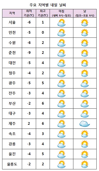 ¼ö¿äÀÏÀÎ ³»ÀÏ(31ÀÏ)Àº Àü±¹ÀÌ ´ëü·Î ¸¼Àº °¡¿îµ¥ ³· µ¿¾È ±â¿ÂÀÌ ¿µ»ó±Ç¿¡ µé°ÚÀ¸³ª, Á¦ÁÖµµ´Â ¹ãºÎÅÍ ´« ¶Ç´Â ºñ°¡ ³»¸®°Ú´Ù. ¹Î°£±â»ó±â¾÷ ÄÉÀÌ¿þ´õ´Â ¡°³»ÀÏ ¿ì¸®³ª¶ó´Â Áß±¹ ÁߺÎÁö¹æ¿¡ À§Ä¡ÇÑ °í±â¾ÐÀÇ °¡ÀåÀÚ¸®¿¡ µé°ÚÀ¸³ª, Á¦ÁÖµµ´Â Á¦ÁÖ ³²ÂÊÇØ»óÀ» Áö³ª´Â ¾àÇÑ ±â¾Ð°ñÀÇ ¿µÇâÀ» Á¡Â÷ ¹Þ°Ú´Ù¡±¸ç ¡°Àü±¹¿¡ °¡²û ±¸¸§ÀÌ ¸¹°Ú°í, Á¦ÁÖµµ´Â Á¡Â÷ Èå·ÁÁ® ¹ãºÎÅÍ ´« ¶Ç´Â ºñ°¡ ¿À°Ú´Ù¡±°í ¿¹º¸Çß´Ù. ÀÌ¾î ¡°³»ÀÏ ¾ÆÄ§ ÃÖÀú±â¿ÂÀº -9¡É¿¡¼ 2¡É·Î ¿À´Ãº¸´Ù 1¡É~8¡Éµµ °¡·® ¿À¸£¸ç ¿¹³â ±â¿ÂÀ» ȸº¹ÇϰڴÙ. ³· ÃÖ°í±â¿Âµµ 0¡É¿¡¼ 6¡É·Î ¿µ»ó±ÇÀ» ȸº¹Çϸç ÇÑÆÄ´Â ÁÖÃãÇϰڴ١±°í ÀüÇß´Ù.