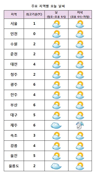 ¼ö¿äÀÏÀÎ ¿À´Ã(31ÀÏ)Àº Àü±¹ÀÌ ´ëü·Î ±¸¸§ÀÌ ¸¹Àº °¡¿îµ¥ ¿ÀÈĺÎÅÍ´Â ±â¿ÂÀÌ ¿µ»ó±ÇÀ» º¸À̸ç ÇÑÆÄ°¡ ÁÖÃãÇϰڴÙ. ¹Î°£±â»ó±â¾÷ ÄÉÀÌ¿þ´õ´Â ¡°¿À´Ã ¿ì¸®³ª¶ó´Â Áß±¹ ÁߺÎÁö¹æ¿¡ À§Ä¡ÇÑ °í±â¾ÐÀÇ °¡ÀåÀÚ¸®¿¡ µé°ÚÀ¸³ª, Á¦ÁÖµµ´Â Á¦ÁÖµµ ³²ÂÊÇØ»óÀ» Áö³ª´Â ¾àÇÑ ±â¾Ð°ñÀÇ ¿µÇâÀ» Á¡Â÷ ¹Þ°Ú´Ù¡±¸ç ¡°Àü±¹¿¡ ±¸¸§ÀÌ ¸¹°Ú°í, Á¦ÁÖµµ´Â Á¡Â÷ Èå·ÁÁ® ¹ãºÎÅÍ ³»ÀÏ(2¿ù 1ÀÏ) »õº®»çÀÌ ºñ ¶Ç´Â ´«ÀÌ ¿À°Ú´Ù¡±°í ¿¹º¸Çß´Ù. * ¿¹»ó °¼ö·®(Àû¼³) - Á¦ÁÖµµ : 5mm³»¿Ü(1~3cm) ÀÌ¾î ¡°Çػ󿡼 »ý¼ºµÈ ±¸¸§´ëÀÇ ¿µÇâÀ¸·Î ¿ï¸ªµµ, µ¶µµ´Â ¿ÀÀü±îÁö ´«ÀÌ ¿À´Ù Á¡Â÷ ±×Ä¡°Ú´Ù¡±¸ç ¡°¼Ç³ÀÇ À¯ÀÔÀ¸·Î ±â¿ÂÀÌ Â÷Â÷ ¿À¸£¸é¼ ¿À´Ã ³·ºÎÅÍ Æò³â°ú ºñ½ÁÇÑ ºÐÆ÷¸¦ º¸À̰ڰí, ÁÖ¸»ºÎÅÍ ´Ù½Ã ±â¿ÂÀÌ Å©°Ô ¶³¾îÁö¸é¼ Ãß¿öÁö°Ú´Ù¡±°í ÀüÇß´Ù. ¿À´Ã ³· ÃÖ°í±â¿ÂÀº ¼¿ï 1¡É, ´ëÀü¡¤°¸ª¡¤ÀüÁÖ 4¡É, ºÎ»ê¡¤Á¦ÁÖ 6¡É µî Àü±¹ÀÌ 0~6¡ÉÀÇ ºÐÆ÷¸¦ º¸À̰ڴÙ.