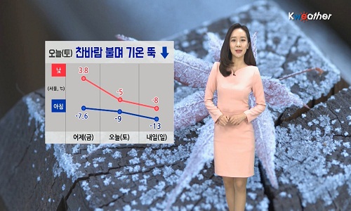 ÇÑÆí, ¿À´ÃºÎÅÍ´Â ´Ù½Ã °ÇÑ ÃßÀ§°¡ ã¾Æ¿À°Ú´Ù. °æ±âºÏºÎ³»·ú°ú °¿ø¿µ¼, ÃæºÏºÏºÎ¿Í °æºÏºÏºÎ³»·ú¿¡ ÇÑÆÄÆ¯º¸°¡ ³»·ÁÁø °¡¿îµ¥ ¾ÆÄ§±â¿Â ¼¿ï°ú Ãáõ -9¡É, ÀüÁÖ -5¡É, ´ë±¸¿Í °¸ª -4¡Éµµ°¡ µÇ°Ú´Ù. °ÇÑ ¹Ù¶÷¿¡ ü°¨¿Âµµ´Â ´õ ³·À» °ÍÀ¸·Î º¸¿© º¸¿ÂÀ¯Áö¿¡ °¢º°È÷ À¯ÀÇÇØ¾ß°Ú´Ù.