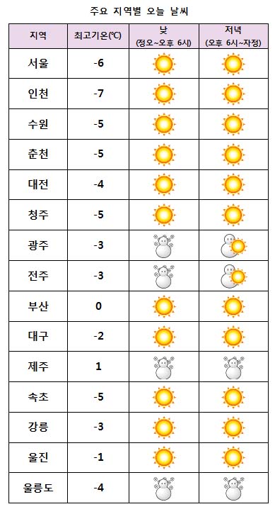 È¿äÀÏÀÎ ³»ÀÏ(6ÀÏ)µµ Àü±¹ÀÌ Çѳ·¿¡ ´ëºÎºÐ ¿µÇϱÇÀ» º¸À̸ç Ãä°Ú°í, ¼ÇؾȰú Á¦ÁÖµµ µî ÀϺΠÁö¿ª¿¡ ÇѶ§ ´«ÀÌ ³»¸®°Ú´Ù. ¹Î°£±â»ó±â¾÷ ÄÉÀÌ¿þ´õ´Â ¡°³»ÀÏ ¿ì¸®³ª¶ó´Â Áß±¹ ºÏºÎÁö¹æ¿¡ À§Ä¡ÇÑ Âù ´ë·ú°í±â¾ÐÀÇ ¿µÇâÀ» ¹Þ°Ú´Ù¡±¸ç ¡°Àü±¹ÀÌ ´ëü·Î ¸¼Àº °¡¿îµ¥ ÇØ»ó¿¡¼ ¸¸µé¾îÁø ´« ±¸¸§´ëÀÇ ¿µÇâÀ¸·Î Ãæ³²¼ÇؾÈ, Àü¶óµµ, Á¦ÁÖµµ, ¿ï¸ªµµ, µ¶µµ´Â È帮°í ´«ÀÌ ¿À´Ù°¡ ´ÊÀº ¿ÀÈÄ¿¡ Á¡Â÷ ±×Ä¡°Ú´Ù¡±°í ¿¹º¸Çß´Ù. * ¿¹»ó °¼ö·®(5~6ÀÏ) - Á¦Áֻ갣, ¿ï¸ªµµ, µ¶µµ(~7ÀÏ) : 10~30mm - Àü¶ó¼ÇØ¾È : 5~10mm - Àü¶ó³»·ú, Á¦ÁÖµµ, Ãæ³²¼ÇؾÈ(6ÀÏ) : 5mm¹Ì¸¸ * ¿¹»óÀû¼³(5~6ÀÏ) - Á¦Áֻ갣, ¿ï¸ªµµ, µ¶µµ(~7ÀÏ) : 10~30cm - Àü¶ó¼ÇØ¾È : 2~7cm - Àü¶ó³»·ú, Á¦ÁÖµµ, Ãæ³²¼ÇؾÈ(6ÀÏ) : 1~3cm ¾ÆÄ§ ÃÖÀú±â¿ÂÀº -14¡É¿¡¼ -1¡É, ³· ÃÖ°í±â¿ÂÀº -7¡É¿¡¼ 1¡É°¡ µÇ°Ú´Ù.