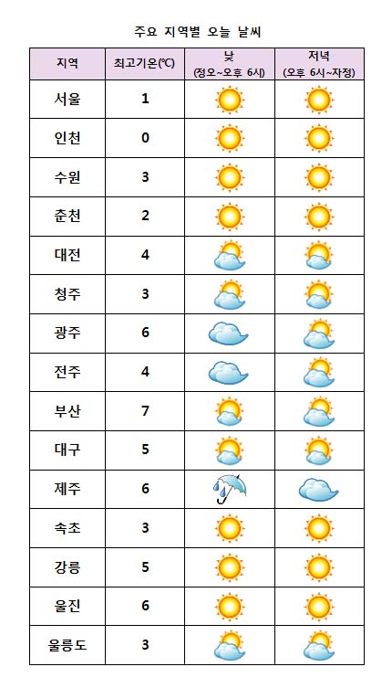 ¿À´Ã ³· ÃÖ°í±â¿ÂÀº ¼¿ï 1¡É, ´ëÀü¡¤ÀüÁÖ 4¡É, ºÎ»ê 7¡É µî Àü±¹ÀÌ 0~7¡ÉÀÇ ºÐÆ÷¸¦ º¸À̰ڴÙ.