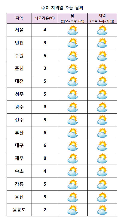 È¿äÀÏÀÎ ³»ÀÏ(13ÀÏ)Àº Àü±¹ÀÌ ´ëü·Î ¸¼°ÚÀ¸³ª È£³² ÀϺΠÁö¿ªÀº »õº®±îÁö ´« ¶Ç´Â ºñ°¡ ¿À´Â °÷ÀÌ ÀÖ°Ú´Ù. ¾Æ¿ï·¯ Çѳ·ºÎÅÍ ±â¿ÂÀº ¿µ»ó±ÇÀ» ȸº¹ÇϰڴÙ. ¹Î°£±â»ó±â¾÷ ÄÉÀÌ¿þ´õ´Â ¡°³»ÀÏ ¿ì¸®³ª¶ó´Â ³²ÇØ»ó¿¡ À§Ä¡ÇÑ °í±â¾ÐÀÇ °¡ÀåÀÚ¸®¿¡ µé°Ú´Ù¡±¸ç ¡°Àü±¹¿¡ °¡²û ±¸¸§ÀÌ ¸¹Àº °¡¿îµ¥ ÇØ±âÂ÷·Î ÀÎÇØ »ý¼ºµÈ ±¸¸§´ëÀÇ ¿µÇâÀ¸·Î ÃæÃ»µµ, Àü¶óµµ, Á¦ÁÖµµ´Â È帮°í ´«ÀÌ ³»¸®´Ù°¡ »õº®¿¡ Á¡Â÷ °³°Ú´Ù¡±°í ¿¹º¸Çß´Ù. * ¿¹»óÀû¼³/°¼ö·®(~13ÀÏ) - Á¦ÁÖµµ»ê°£ : 10~20cm / 5~20mm - Ãæ³², Àü¶óµµ, Á¦ÁÖµµ(»ê°£Á¦¿Ü) : 2~7cm(¸¹Àº °÷ 10cmÀÌ»ó) / 5mm³»¿Ü - ÃæºÏ, °æ»ó¼ºÎ³»·ú : 1~3cm / 5mm³»¿Ü - °æ±â³²ºÎ(12ÀÏ) : 1cm³»¿Ü / 5mm¹Ì¸¸ ¾ÆÄ§ ÃÖÀú±â¿ÂÀº -11¡É¿¡¼ 4¡É, ³· ÃÖ°í±â¿ÂÀº 3¡É¿¡¼ 8¡É°¡ µÇ°Ú´Ù. ¹Ì¼¼¸ÕÁö ³óµµ´Â ³²¼±â·ù¸¦ Ÿ°í ±¹¿Ü¿¡¼ À¯ÀԵǴ ¿À¿°¹°ÁúÀÌ Áõ°¡ÇÏ¸é¼ ¼ÂÊÁö¹æÀ» Áß½ÉÀ¸·Î ¡®ÇѶ§ ³ª»Ý¡¯ ´Ü°è¸¦ º¸À̰ڰí, µ¿ÂÊÁö¹æÀº ±× ¿µÇâÀÌ Àû¾î ¡®º¸Åë¡® ´Ü°è¸¦ º¸À̰ڴÙ.