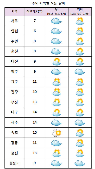 ³· ÃÖ°í±â¿ÂÀº ¼¿ï 7¡É, ´ëÀü 9¡É, ±¤ÁÖ 11¡É, ºÎ»ê 13¡É µî Àü±¹ÀÌ 6~14¡ÉÀÇ ºÐÆ÷¸¦ º¸À̰ڴÙ.