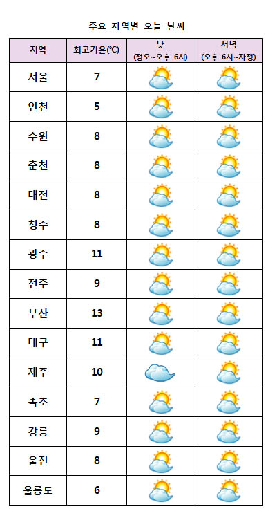 Àý±â»ó ¿ì¼öÀÎ ¿À´Ã ¿ù¿äÀÏ(19ÀÏ)Àº Àü±¹ÀÌ ´ëü·Î ±¸¸§ÀÌ ¸¹Àº °¡¿îµ¥ Æ÷±ÙÇÒ Àü¸ÁÀÌ´Ù. ¹Î°£±â»ó±â¾÷ ÄÉÀÌ¿þ´õ´Â ¡°¿À´Ã ¿ì¸®³ª¶ó´Â Áß±¹ ºÏºÎÁö¹æ¿¡ À§Ä¡ÇÑ °í±â¾ÐÀÇ °¡ÀåÀÚ¸®¿¡ µé°ÚÀ¸³ª, Á¦ÁÖµµ´Â Á¦ÁÖµµ³²ÂÊÇØ»óÀ» Áö³ª´Â ±â¾Ð°ñÀÇ ¿µÇâÀ» ¹Þ´Ù°¡ ¹þ¾î³ª°Ú´Ù¡±¸ç ¡°Àü±¹¿¡ ±¸¸§ÀÌ ¸¹°ÚÀ¸³ª, Á¦ÁÖµµ´Â È帰 ÈÄ °³°Ú´Ù¡±°í ¿¹º¸Çß´Ù. ³· ÃÖ°í±â¿ÂÀº ¼¿ï¡¤¼ÓÃÊ 7¡É, ±¤ÁÖ¡¤´ë±¸ 11¡É, ºÎ»ê 13¡É µî Àü±¹ÀÌ 5~13¡ÉÀÇ ºÐÆ÷¸¦ º¸À̰ڴÙ. ´çºÐ°£ Æò³â°ú ºñ½ÁÇÑ ±â¿ÂºÐÆ÷¸¦ º¸À̰ÚÀ¸³ª ³»·úÀ» Áß½ÉÀ¸·Î ³·°ú ¹ãÀÇ ±â¿ÂÂ÷°¡ Å©°Ú´Ù.