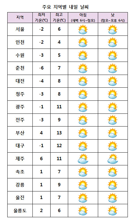 ¹Î°£±â»ó±â¾÷ ÄÉÀÌ¿þ´õ´Â ¡°³»ÀÏ ¿ì¸®³ª¶ó´Â Áß±¹ ºÏºÎÁö¹æ¿¡¼ ³²µ¿ÁøÇÏ´Â °í±â¾ÐÀÇ ¿µÇâÀ» ¹Þ°Ú´Ù¡±¸ç ¡°Àü±¹ÀÌ ´ëü·Î ¸¼°ÚÀ¸³ª, Á¦ÁÖµµ´Â ±¸¸§ÀÌ ¸¹°Ú´Ù¡±°í ¿¹º¸Çß´Ù. ¾ÆÄ§ ÃÖÀú±â¿ÂÀº -6¡É¿¡¼ 6¡É, ³· ÃÖ°í±â¿ÂÀº 4¡É¿¡¼ 13¡É°¡ µÇ°Ú´Ù. ´çºÐ°£ ±â¿ÂÀº Æò³â°ú ºñ½ÁÇÑ ºÐÆ÷¸¦ º¸À̰ÚÀ¸³ª, ³»·úÀ» Áß½ÉÀ¸·Î ³·°ú ¹ãÀÇ ±â¿ÂÂ÷°¡ Å©°ÚÀ¸´Ï, °Ç°°ü¸®¿¡ À¯ÀÇÇÏ´Â °ÍÀÌ ÁÁ°Ú´Ù.
