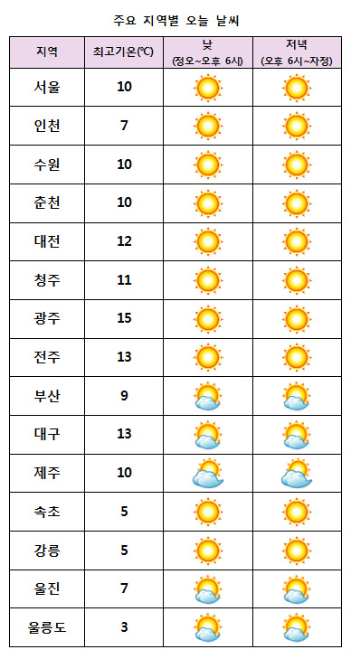 °æÄ¨ÀÎ ¿À´Ã È¿äÀÏ(6ÀÏ) ¿ì¸®³ª¶ó´Â Àü±¹ÀÌ ´ëü·Î ¸¼Àº °¡¿îµ¥ Æ÷±ÙÇϰڰí, Àϱ³Â÷°¡ Å« ÆøÀ¸·Î ¹ú¾îÁö°Ú´Ù. ¹Î°£±â»ó±â¾÷ ÄÉÀÌ¿þ´õ´Â ¡°¿À´Ã ¿ì¸®³ª¶ó´Â Áß±¹ ºÏµ¿Áö¹æÀÌ À§Ä¡ÇÑ °í±â¾ÐÀÇ °¡ÀåÀÚ¸®¿¡ µé°Ú´Ù¡±¸ç ¡°Àü±¹ÀÌ ´ëü·Î ¸¼°Ú°í, ±â¿ÂÀº Æò³â°ú ºñ½ÁÇÑ ¼öÁØÀ» º¸ÀÌ¸ç ´ëü·Î Æ÷±ÙÇϰÚÀ¸³ª ³»·úÀ» Áß½ÉÀ¸·Î ³·°ú ¹ãÀÇ ±â¿ÂÂ÷°¡ Å©°Ú´Ù¡±°í ¿¹º¸Çß´Ù. ¿À´Ã ³· ÃÖ°í±â¿ÂÀº ¼¿ï¡¤Á¦ÁÖ 10¡É, ´ëÀü 12¡É, ÀüÁÖ¡¤´ë±¸ 13¡É µî Àü±¹ÀÌ 5~15¡ÉÀÇ ºÐÆ÷¸¦ º¸À̰ڴÙ.