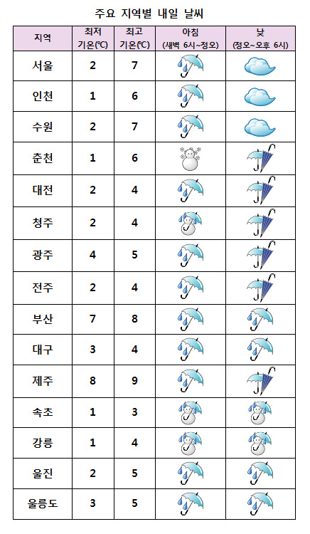 ¸ñ¿äÀÏÀÎ ³»ÀÏ(8ÀÏ) ¿ì¸®³ª¶ó´Â Àü±¹ÀÌ ´ëü·Î È帰 °¡¿îµ¥ ºñ ¶Ç´Â ´«ÀÌ ¿À´Ù°¡ ±×Ä¥ Àü¸ÁÀÌ´Ù. ¹Î°£±â»ó±â¾÷ ÄÉÀÌ¿þ´õ´Â ¡°³»ÀÏ ¿ì¸®³ª¶ó´Â ³²ÇØ»óÀ» Áö³ª´Â Àú±â¾ÐÀÇ ¿µÇâÀ» ¹Þ´Ù°¡ Á¡Â÷ ¹þ¾î³ª°Ú´Ù¡±¸ç ¡°Àü±¹ÀÌ ´ëü·Î È帮°í ºñ°¡ ¿À°Ú°í, °¿øµµ¿Í °æ±âºÏºÎ, °æ±âµ¿ºÎ, ÃæÃ»³»·ú, °æºÏºÏºÎ ´«ÀÌ ¿À´Â °÷µµ ÀÖ°Ú´Ù¡±°í ¿¹º¸Çß´Ù. ÀÌ¾î ¡°Àü±¹¿¡ ³»¸®´Â ´«¡¤ºñ´Â ºÏ¼ÂʺÎÅÍ ±×Ä¡±â ½ÃÀÛÇØ ¸ð·¹(9ÀÏ) ¿ÀÀü¿¡ ´ëºÎºÐ ±×Ä¡°Ú´Ù¡±¸ç ¡°°¿ø¿µµ¿¿¡´Â ¸Å¿ì ¸¹Àº ´«ÀÌ ³»¸®°Ú°í, °æºÏºÏµ¿»êÁö, °¿ø¿µ¼, ÃæºÏ¿¡µµ ¸¹Àº ´«ÀÌ ³»¸®´Â °÷ÀÌ ÀÖ°ÚÀ¸´Ï, µµ·Î°áºù°ú ºñ´ÒÇϿ콺 ºØ±« µî ½Ã¼³¹° °ü¸®¿Í ±³Åë¾ÈÀü¿¡ ÁÖÀǸ¦ ±â¿ï¿©¾ß°Ú´Ù¡±°í ÀüÇß´Ù. * ¿¹»ó °¼ö·®(7ÀÏ ¿ÀÈÄ~9ÀÏ) - Á¦ÁÖµµ, °¿ø¿µµ¿, Àü¶óµµ(8ÀϱîÁö), °æ»óµµ : 40~80mm(¸¹Àº °÷ Á¦ÁÖµµ»ê°£ 120mmÀÌ»ó) - °¿ø¿µ¼, ÃæÃ»µµ : 20~40mm - ¼¿ï°æ±â : 5~20mm * ¿¹»ó Àû¼³(8~9ÀÏ) - °¿ø¿µµ¿, °æºÏºÏºÎ»êÁö : 5~20cm(¸¹Àº °÷ »ê°£ 40cmÀÌ»ó) - °¿ø¿µ¼, °æºÏºÏºÎ³»·ú(»êÁöÁ¦¿Ü) : 2~7cm - °æ±âºÏºÎ, °æ±âµ¿ºÎ, ÃæÃ»ºÏµµ : 1~3cm ¾ÆÄ§ÃÖÀú±â¿ÂÀº 1¡É¿¡¼ 8¡É, ³· ÃÖ°í±â¿ÂÀº 3¡É¿¡¼ 9¡É°¡ µÇ°Ú´Ù. ³»ÀÏ ³·ºÎÅÍ ±â¿ÂÀÌ ¶³¾îÁö°í ¹Ù¶÷µµ °ÇÏ°Ô ºÒ¸é¼ ü°¨¿Âµµ°¡ ³·¾ÆÁ® Ãä°Ú´Ù  ¹Ù´ÙÀÇ ¹°°áÀº Àü ÇØ»ó¿¡¼ 4~5m·Î ¸Å¿ì ³ô°Ô ÀϰڴÙ. ³»ÀÏ(8ÀÏ)ºÎÅÍ ¸ð·¹(9ÀÏ)±îÁö ÇØ¾È°ú Á¦ÁÖµµ¸¦ Áß½ÉÀ¸·Î ¹Ù¶÷ÀÌ ¸Å¿ì °ÇÏ°Ô ºÎ´Â °÷ÀÌ ÀÖ°Ú°í, ³»·ú¿¡µµ ¹Ù¶÷ÀÌ °ÇÏ°Ô ºÎ´Â °÷ÀÌ ÀÖ°ÚÀ¸´Ï ½Ã¼³¹°°ü¸®¿¡ À¯ÀÇÇØ¾ß°Ú´Ù.