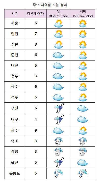 ¸ñ¿äÀÏÀÎ ¿À´Ã(8ÀÏ) ¿ì¸®³ª¶ó´Â Àü±¹¿¡ ºñ ¶Ç´Â ´«ÀÌ ¿À´Ù°¡ Á¡Â÷ ±×Ä¥ Àü¸ÁÀÌ´Ù. ¹Î°£±â»ó±â¾÷ ÄÉÀÌ¿þ´õ´Â ¡°¿À´Ã ¿ì¸®³ª¶ó´Â ³²ÇØ»óÀ» Áö³ª´Â Àú±â¾ÐÀÇ ¿µÇâÀ» ¹Þ´Ù°¡ Á¡Â÷ ¹þ¾î³ª°Ú´Ù¡±¸ç ¡°Àü±¹ÀÌ ´ëü·Î È帮°í ºñ¡¤´«ÀÌ ¿À´Ù°¡ ¿ÀÀü¿¡ ¼¿ï°ú °æ±â, ¼ÇؾÈ, Á¦ÁÖµµ¿¡ Á¡Â÷ ±×Ä¡±â ½ÃÀÛÇØ ´ÊÀº ¿ÀÈÄ¿¡ ´ëºÎºÐ ±×Ä¡°Ú´Ù¡±°í ¿¹º¸Çß´Ù. ÀÌ¾î ¡°µ¿Ç³ÀÇ ¿µÇâÀ¸·Î °¿ø¿µµ¿Àº ³»ÀÏ(9ÀÏ) ³·±îÁö ºñ¡¤´«ÀÌ À̾îÁö°Ú´Ù¡±¸ç ¡°³»ÀÏ(9ÀÏ)±îÁö ÇØ¾È°ú Á¦ÁÖµµ¸¦ Áß½ÉÀ¸·Î ¹Ù¶÷ÀÌ ¸Å¿ì °ÇÏ°Ô ºÎ´Â °÷ÀÌ ÀÖ°Ú°í, ³»·ú¿¡µµ ¹Ù¶÷ÀÌ °ÇÏ°Ô ºÎ´Â °÷ÀÌ ÀÖ°Ú´Ù¡±°í ÀüÇß´Ù. * ¿¹»ó °¼ö·®(8ÀÏ) - °æ»óµµ, °¿ø¿µµ¿(9ÀϱîÁö) : 10~40mm(¸¹Àº °÷ °æ»óÇØ¾È 60mmÀÌ»ó) - °¿ø¿µ¼, ÃæÃ»³»·ú, Àü¶ó³»·ú : 5~10mm - ¼¿ï°æ±â, ¼ÇؾÈ, Á¦ÁÖµµ : 5mm³»¿Ü * ¿¹»ó Àû¼³(8ÀÏ) - °¿ø¿µµ¿(9ÀϱîÁö) : 5~10cm(¸¹Àº °÷ »ê°£ 20cmÀÌ»ó) - ÃæÃ»³»·ú, °¿ø¿µ¼, °æ»óµµ³»·ú»ê°£ : 1~5cm ³· ÃÖ°í±â¿ÂÀº ¼¿ï¡¤Ãáõ¡¤±¤ÁÖ¡¤ºÎ»ê 6¡É, ´ëÀü¡¤ÀüÁÖ 5¡É µî Àü±¹ÀÌ 3~9¡ÉÀÇ ºÐÆ÷¸¦ º¸À̰ڴÙ. ¿À´Ã ³·ºÎÅÍ ±â¿ÂÀÌ ¶³¾îÁö°í ¹Ù¶÷µµ °ÇÏ°Ô ºÒ¸é¼ ü°¨¿Âµµ´Â ³·¾ÆÁ® Ãä°ÚÀ¸´Ï, °Ç°°ü¸®¿¡ À¯ÀÇÇØ¾ß°Ú´Ù.