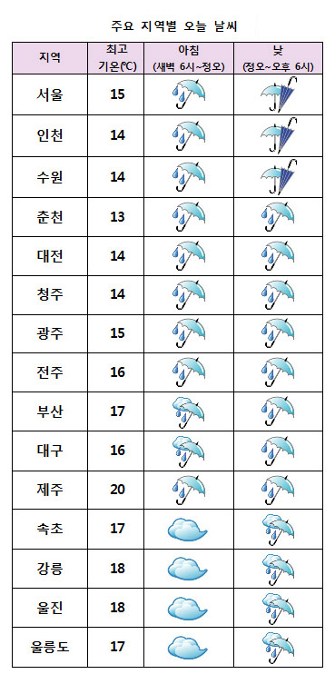 ¸ñ¿äÀÏÀÎ ¿À´Ã(15ÀÏ)Àº Àü±¹ÀÌ È帮°í ºñ°¡ ¿À°Ú°í, ¹ã¿¡ ÁߺÎÁö¹æºÎÅÍ ±×Ä¥ Àü¸ÁÀÌ´Ù. ¹Î°£±â»ó±â¾÷ ÄÉÀÌ¿þ´õ´Â ¡°¿À´Ã ¿ì¸®³ª¶ó´Â ¼ÂÊ¿¡¼ ´Ù°¡¿À´Â Àú±â¾ÐÀÇ ¿µÇâÀ» ¹Þ°Ú´Ù¡±¸ç ¡°Àü±¹ÀÌ ´ëü·Î È帰 °¡¿îµ¥ ºñ°¡ ¿À°Ú°í, ¿ÀÀü¿¡ Àü±¹ ´ëºÎºÐ Áö¿ªÀ¸·Î È®´ëµÇ°Ú´Ù¡±°í ¿¹º¸Çß´Ù. ÀÌ¾î ¡°ºñ´Â ´ÊÀº ¿ÀÈÄ¿¡ ¼¿ï°ú °æ±â¼ºÎÁö¿ªÀ» Áß½ÉÀ¸·Î Á¡Â÷ ±×Ä¡±â ½ÃÀÛÇØ ³»ÀÏ(16ÀÏ) ¿ÀÀü¿¡ ´ëºÎºÐ ±×Ä¡°Ú´Ù¡±°í ÀüÇß´Ù. * ¿¹»ó °¼ö·®(15~16ÀÏ) - (15ÀϱîÁö)¼¿ï°æ±â, °¿ø¿µ¼ : 5~30mm - °¿ø¿µµ¿, ÃæÃ»À̳² : 30~60mm * ¿¹»óÀû¼³(15ÀÏÀú³á~16ÀÏ¿ÀÀü) - °¿ø¿µ¼³²ºÎ, ÃæºÏºÏºÎ, °æºÏºÏºÎ : 1~5cm - °¿ø¿µµ¿, °¿ø»ê°£ : 2~7cm