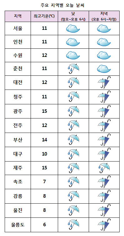 ¿À´Ã ³· ÃÖ°í±â¿ÂÀº ¼¿ï¡¤Ãáõ¡¤Ã»ÁÖ 11¡É, ºÎ»ê 14¡É, ±¤ÁÖ¡¤Á¦ÁÖ 15¡É µî Àü±¹ÀÌ 6~15¡ÉÀÇ ºÐÆ÷¸¦ º¸À̰ڴÙ.