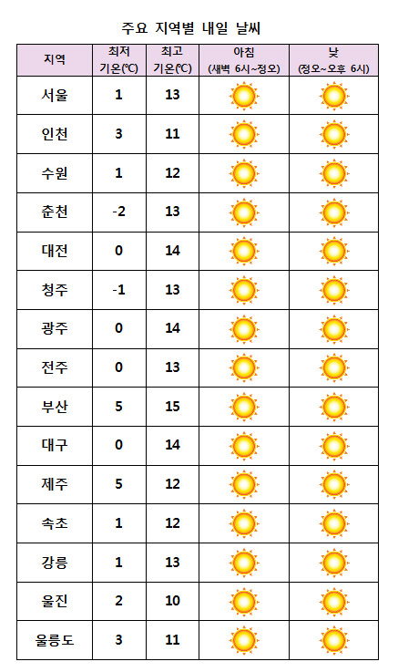 ¾ÆÄ§ ÃÖÀú±â¿ÂÀº -1¡É¿¡¼ 5¡É, ³· ÃÖ°í±â¿ÂÀº 10¡É¿¡¼ 15¡É°¡ µÇ°Ú´Ù.
