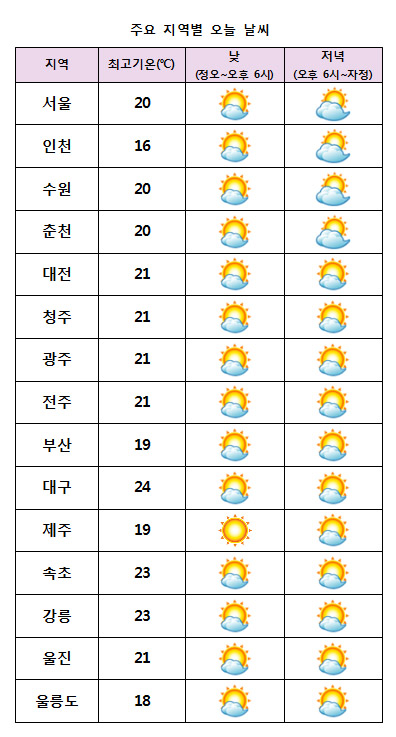µû¶æÇÑ ³²¼Ç³ÀÌ À¯ÀÔµÇ¸é¼ ´çºÐ°£ ±â¿ÂÀº Æò³âº¸´Ù ³ô°Ú´Ù. ±×·¯³ª º¹»ç³Ã°¢¿¡ ÀÇÇØ ³»·úÀ» Áß½ÉÀ¸·Î ³·°ú ¹ãÀÇ ±â¿ÂÂ÷°¡ 15¡É ³»¿Ü·Î ¸Å¿ì Å©°ÚÀ¸´Ï °Ç°°ü¸®¿¡ À¯ÀÇÇØ¾ß°Ú´Ù. ¿À´Ã ³· ÃÖ°í±â¿ÂÀº ¼¿ï¡¤Ãáõ 20¡É, ´ëÀü¡¤±¤ÁÖ 21¡É, ºÎ»ê¡¤Á¦ÁÖ 19¡É µî Àü±¹ÀÌ 16~24¡ÉÀÇ ºÐÆ÷¸¦ º¸À̰ڴÙ.
