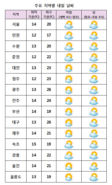 ¾ÆÄ§ÃÖÀú±â¿ÂÀº 12¡É¿¡¼ 15¡É, ³· ÃÖ°í±â¿ÂÀº 17¡É¿¡¼ 26¡É°¡ µÇ°Ú´Ù. ±â¿ÂÀº ³»ÀϱîÁö Æò³âº¸´Ù ³ô°ÚÀ¸³ª ³»·úÀ» Áß½ÉÀ¸·Î Àϱ³Â÷°¡ Å©°Ô ¹ú¾îÁö°Ú´Ù.