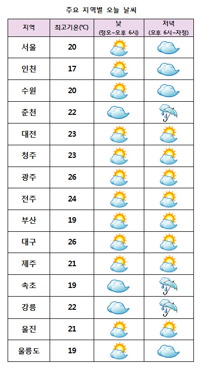 ³· ÃÖ°í±â¿ÂÀº ¼¿ï 20¡É, ´ëÀü 22¡É, ±¤ÁÖ¡¤´ë±¸ 26¡É, ºÎ»ê 19¡É µî Àü±¹ÀÌ 19~26¡ÉÀÇ ºÐÆ÷¸¦ º¸À̰ڴÙ.