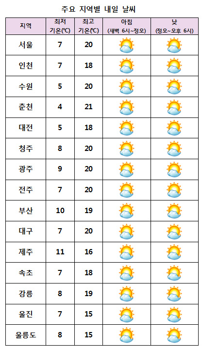 ¾ÆÄ§ ÃÖÀú±â¿ÂÀº 4¡É¿¡¼ 11¡É, ³· ÃÖ°í±â¿ÂÀº 15¡É¿¡¼ 20¡É°¡ µÇ°Ú´Ù.