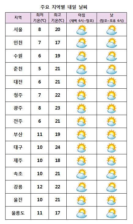 ¾ÆÄ§ ÃÖÀú±â¿ÂÀº 5¡É¿¡¼ 12¡É, ³· ÃÖ°í±â¿ÂÀº 17¡É¿¡¼ 24¡É°¡ µÇ°Ú´Ù.