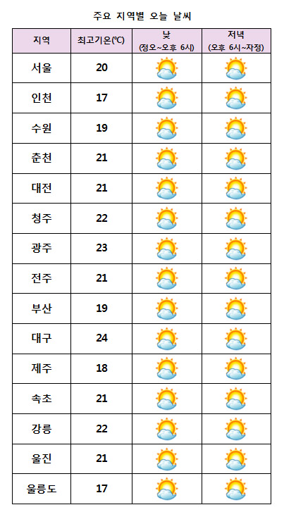 ¿À´Ã ³· ±â¿ÂÀº ¼¿ï 20¡É, ´ëÀü¡¤¼ÓÃÊ¡¤ÀüÁÖ 21¡É, ºÎ»ê 19¡É µî Àü±¹ÀÌ 17~24¡ÉÀÇ ºÐÆ÷¸¦ º¸À̰ڴÙ.