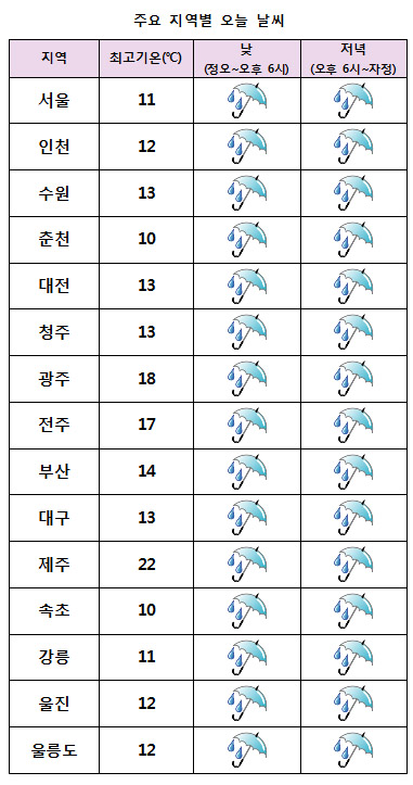 ÀÌ¾î ¡°³· ÃÖ°í±â¿ÂÀº ¼¿ï¡¤°¸ª 11¡É, ´ëÀü¡¤´ë±¸ 13¡É, ºÎ»ê 14¡É, ±¤ÁÖ 18¡É µî Àü±¹ÀÌ 10~22¡ÉÀÇ ºÐÆ÷¸¦ º¸À̰ڴ١±¸ç ¡°³»ÀÏ(24ÀÏ)±îÁö Àü±¹ ´ëºÎºÐ Áö¿ª¿¡ ºñ°¡ ³»¸®¸é¼ ³· ±â¿ÂÀº Æò³â°ú ºñ½ÁÇϰųª ³·°Ú´Ù¡±°í ÀüÇß´Ù.