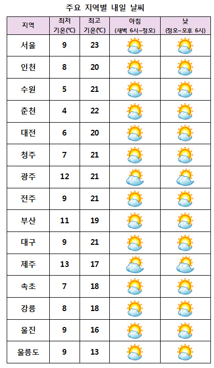 ¼ö¿äÀÏÀÎ ³»ÀÏ(25ÀÏ)Àº Àü±¹ÀÌ ´ëü·Î ¸¼Àº °¡¿îµ¥ Æò³â ±â¿ÂÀ» ¿ôµµ´Â ³¯¾¾°¡ µÇ°Ú´Ù. ¹Î°£±â»ó±â¾÷ ÄÉÀÌ¿þ´õ´Â ¡°¿À´Ã ¿ì¸®³ª¶ó´Â Áß±¹ ÁߺÎÁö¹æ¿¡¼ µ¿ÁøÇÏ´Â °í±â¾ÐÀÇ ¿µÇâÀ» ¹Þ°Ú´Ù¡±¸ç ¡°Àü±¹ÀÌ ´ëü·Î ¸¼Àº °¡¿îµ¥ Á¦ÁÖµµ¿Í Àü³²Àº °¡²û ±¸¸§ÀÌ ¸¹°Ú°í, ±× ¹ÛÀÇ ÃæÃ»À̳²Áö¹æÀº Á¡Â÷ °³°Ú´Ù¡±°í ¿¹º¸Çß´Ù. ³»ÀϺÎÅÍ ±â¿ÂÀÌ Â÷Â÷ ¿À¸£¸é¼ ´çºÐ°£ Æò³â°ú ºñ½ÁÇϰųª Á¶±Ý ³ô°Ú°í, ³·°ú ¹ãÀÇ ±â¿ÂÂ÷°¡ Å©°ÚÀ¸´Ï °Ç°°ü¸®¿¡ ÁÖÀǰ¡ ¿ä±¸µÈ´Ù. ¾ÆÄ§ ÃÖÀú±â¿ÂÀº 4¡É¿¡¼ 13¡É, ³· ÃÖ°í±â¿ÂÀº 13¡É¿¡¼ 23¡É°¡ µÇ°Ú´Ù.