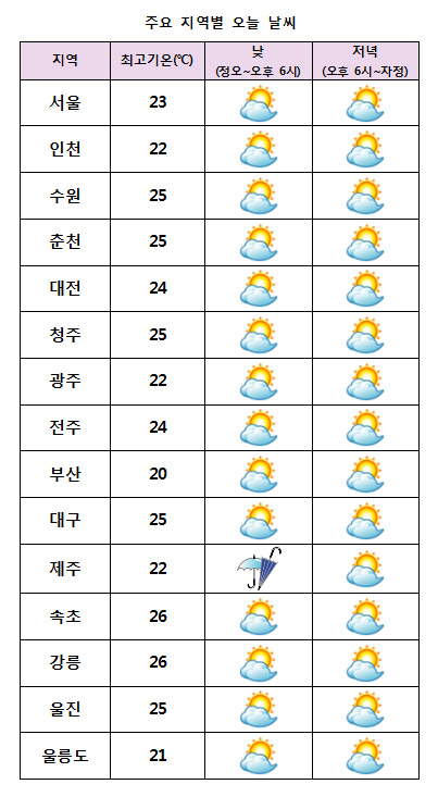 ¿À´Ã ³· ±â¿ÂÀº ¼¿ï 23¡É, ´ëÀü¡¤ÀüÁÖ 24¡É, ºÎ»ê 20¡É µî 20~26¡ÉÀÇ ºÐÆ÷¸¦ º¸À̰ڴÙ.