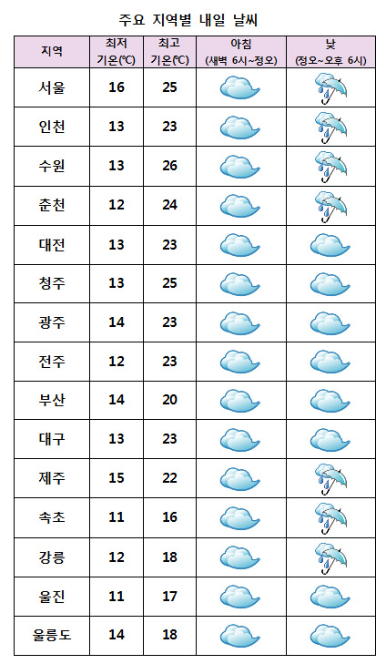 ÇÑÆí À̹ø ÁÖ´Â ±â¾Ð°ñÀÇ ¿µÇâÀ¸·Î 2ÀÏ Àü±¹¿¡ ºñ°¡ ¿À´Ù°¡ ±×Ä¡°Ú´Ù. ÁߺÎÁö¹æÀº 3ÀÏ ´Ù½Ã ºñ°¡ ³»¸®°Ú°í, ³²ºÎÁö¹æÀº ±¸¸§ÀÌ ¸¹°Ú´Ù. 6Àϵµ Àü±¹¿¡ ºñ°¡ ¿À°Ú°í, ±× ¹ÛÀÇ ³¯Àº °í±â¾ÐÀÇ ¿µÇâÀ¸·Î °¡²û ±¸¸§ÀÌ ¸¹°Ú´Ù.
