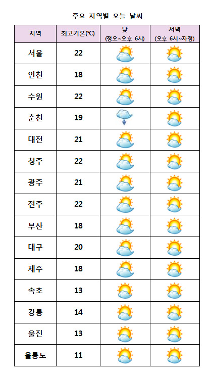 ³· ÃÖ°í ±â¿ÂÀº ¼¿ï¡¤Ã»ÁÖ¡¤ÀüÁÖ 22¡É, ÀÎõ¡¤ºÎ»ê¡¤Á¦ÁÖ 18¡É, ¼ÓÃÊ 13¡É µî Àü±¹ 13~22¡ÉÀÇ ºÐÆ÷¸¦ º¸À̰ڴÙ. ¹Ì¼¼¸ÕÁö ³óµµ´Â ±¹³» ´ë±âÀÇ ¼øÈ¯ÀÌ ¿øÈ°ÇÏ°í ±¹¿Ü¿¡¼ À¯ÀԵǴ ´ë±â¿À¿°¹°ÁúÀÌ Àû¾î ¿ÀÀü¿¡ Á¦ÁÖµµ ¡®º¸Å롯, ±× ¹ÛÀÇ Àü±¹ ¡®ÁÁÀ½¡¯ ´Ü°è°¡ µÇ°Ú´Ù. ¿ÀÈĺÎÅÍ´Â ¼ÂÊÁö¹æÀÌ ¡®º¸Å롯, µ¿ÂÊÁö¹æÀº ¡®ÁÁÀ½¡¯ ´Ü°è°¡ µÇ°Ú´Ù. ¿À´Ã ³·±îÁö °æ»óµ¿Çؾȿ¡´Â ¹Ù¶÷ÀÌ °ÇÏ°Ô ºÒ°Ú°í, ±× ¹ÛÀÇ ÇØ¾È¿¡µµ ¾à°£ °ÇÏ°Ô ºÎ´Â °÷ÀÌ ÀÖ°Ú´Ù. ¹Ù´ÙÀÇ ¹°°áÀº ³²ÇØ¿Í µ¿ÇØ»óÀÌ ÃÖ°í 4m·Î ³ô°Ú°í, ¼ÇØ»óÀ» Áß½ÉÀ¸·Î´Â 0.5~2m·Î ÀϰڴÙ. ³²ÇØ»ó°ú Á¦ÁÖµµÀüÇØ»ó, µ¿Çػ󿡴 dz¶ûƯº¸°¡ ¹ßÈ¿µÈ °¡¿îµ¥ ³»ÀÏ(10ÀÏ) »õº®±îÁö ¹Ù¶÷ÀÌ ¸Å¿ì °ÇÏ°Ô ºÒ°í, ¹°°áÀÌ ¸Å¿ì ³ô°Ô ÀϰڴÙ. ÇÑÆí À̹ø ÁÖ´Â ±â¾Ð°ñÀÇ ¿µÇâÀ¸·Î 12~13ÀÏ Àü±¹¿¡ ºñ°¡ ¿À°Ú´Ù. ±× ¹ÛÀÇ ³¯Àº °í±â¾ÐÀÇ ¿µÇâÀ¸·Î °¡²û ±¸¸§ÀÌ ¸¹°Ú´Ù. ÃÖÀ¯¸® ¿ÂÄÉÀÌ¿þ´õ ±âÀÚ YRmeteo@onkweather.com