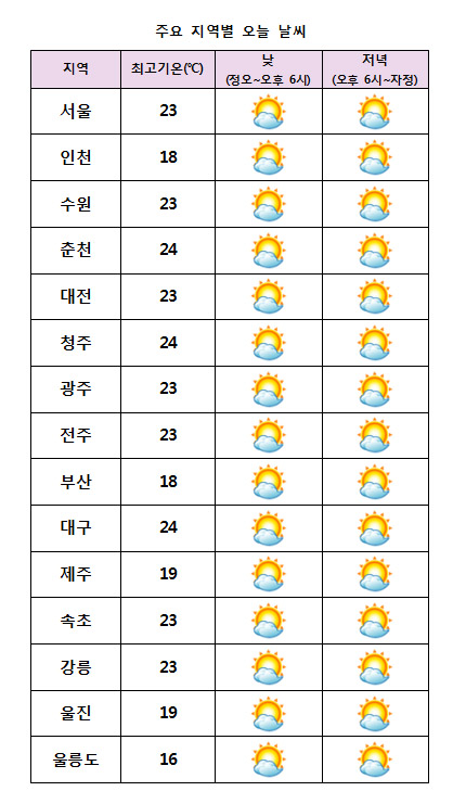 ¸ñ¿äÀÏÀÎ ¿À´Ã(10ÀÏ)Àº Àü±¹ÀÌ ´ëü·Î ¸¼Àº °¡¿îµ¥ ¹Ì¼¼¸ÕÁö ³óµµµµ ³·¾Æ »êÃ¥Çϱâ ÁÁ°Ú´Ù. ¹Î°£±â»ó±â¾÷ ÄÉÀÌ¿þ´õ´Â ¡°¿À´Ã ¿ì¸®³ª¶ó´Â ¼Çػ󿡼 ³²µ¿ÁøÇÏ´Â °í±â¾ÐÀÇ ¿µÇâÀ» ¹Þ¾Æ Àü±¹ÀÌ ´ëü·Î ¸¼°Ú´Ù¡±¸ç ¡°±â¿ÂÀº Æò³â°ú ºñ½ÁÇÑ ¼öÁØÀÌ µÇ°Ú´Ù¡±°í ¿¹º¸Çß´Ù. ¿À´Ã ³· ±â¿ÂÀº ¼¿ï¡¤´ëÀü¡¤±¤ÁÖ 23¡É, ÀÎõ¡¤ºÎ»ê 18¡É µî Àü±¹ÀÌ 18~24¡ÉÀÇ ºÐÆ÷¸¦ º¸À̰ڴÙ.