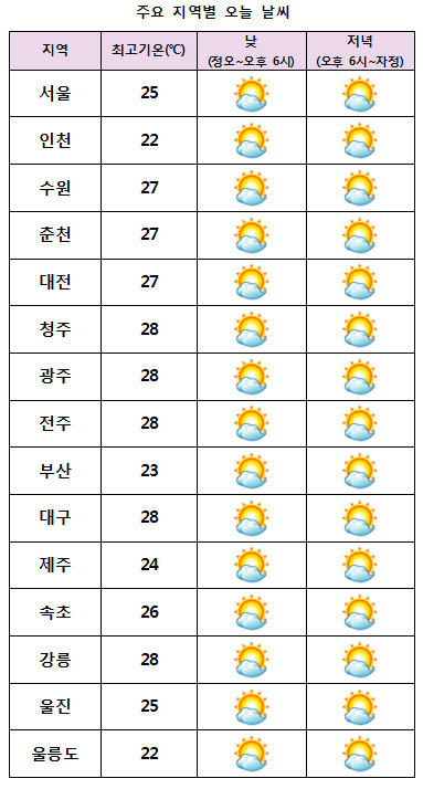 ³· ÃÖ°í±â¿ÂÀº ¼¿ï 25¡É, ´ëÀü 27¡É, ºÎ»ê 23¡É µî Àü±¹ÀÌ 22~28¡ÉÀÇ ºÐÆ÷¸¦ º¸À̰ڴÙ.
