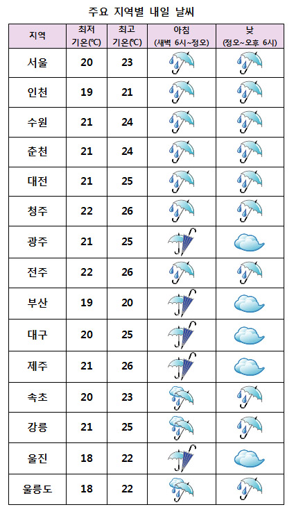 ¹Î°£±â»ó±â¾÷ ÄÉÀÌ¿þ´õ´Â ¡°³»ÀÏ ¿ì¸®³ª¶ó´Â ±â¾Ð°ñÀÇ ¿µÇâÀ¸·Î Èå·ÁÁ® ºñ°¡ ¿À°Ú´Ù¡±¸ç ¡°»õº®¿¡ ÁߺÎÁö¹æ¿¡¼ ½ÃÀÛµÈ ºñ´Â ¾ÆÄ§¿¡ Àü±¹À¸·Î È®´ëµÇ°Ú°í, °æ»óµµ¿Í Àü¶ó³²µµ, Á¦ÁÖµµ´Â ¿ÀÈĺÎÅÍ ¹ã»çÀÌ ¼Ò°»óŸ¦ º¸ÀÏ ¶§°¡ ÀÖ°Ú´Ù¡±°í ¿¹º¸Çß´Ù.