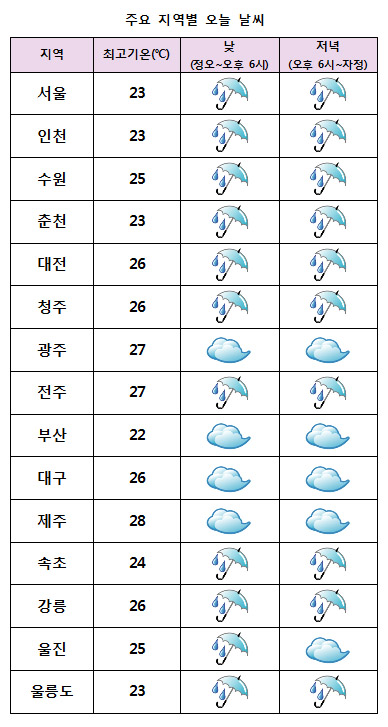 ±â¿ÂÀº ¾ÆÄ§±îÁö Æò³âº¸´Ù ³ô°ÚÀ¸³ª ³· ÃÖ°í±â¿ÂÀº ¼¿ï¡¤Ãáõ 23¡É, ´ëÀü¡¤´ë±¸ 26¡É, ±¤ÁÖ 27¡É, ºÎ»ê 22¡É µî Àü±¹ÀÌ 22~28¡ÉÀÇ ºÐÆ÷¸¦ º¸ÀÌ¸ç Æò³â°ú ºñ½ÁÇϰڴÙ.