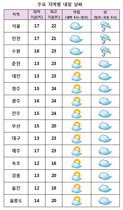 ¾ÆÄ§ ÃÖÀú±â¿ÂÀº 12¡É¿¡¼ 17¡É, ³· ÃÖ°í±â¿ÂÀº 16¡É¿¡¼ 24¡É°¡ µÇ°Ú´Ù. ´ëºÎºÐ Áö¿ªÀÌ Æò³â°ú ºñ½ÁÇÑ ±â¿ÂºÐÆ÷¸¦ º¸À̰ÚÀ¸³ª, °¿ø¿µµ¿°ú °æ»óµµ´Â µ¿Ç³ÀÇ ¿µÇâÀ¸·Î Æò³âº¸´Ù ³·°Ú´Ù.