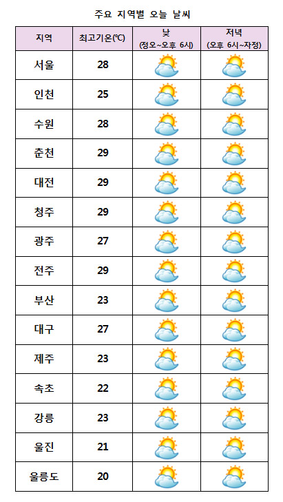 ¿À´Ã ³· ÃÖ°í±â¿ÂÀº ¼¿ï 28¡É, ´ëÀü¡¤Ãáõ¡¤ÀüÁÖ 29¡É, ºÎ»ê¡¤Á¦ÁÖ 23¡É µî Àü±¹ÀÌ 20~29¡ÉÀÇ ºÐÆ÷¸¦ º¸À̰ڴÙ.