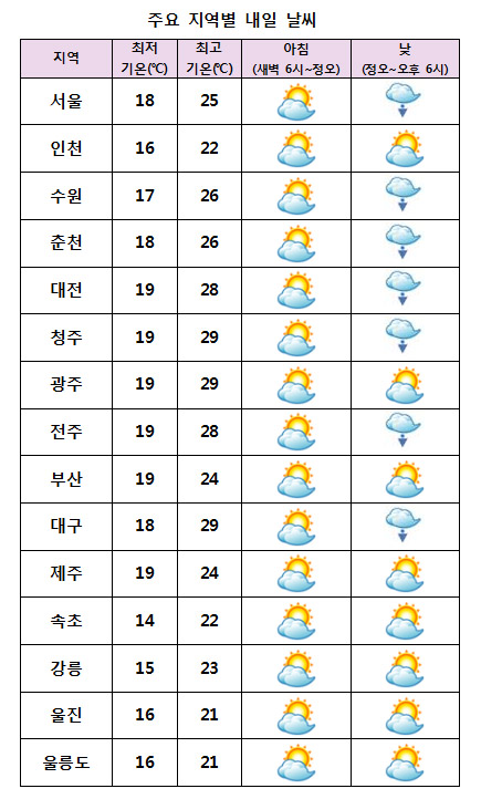 ¾ÆÄ§ ÃÖÀú±â¿ÂÀº 14¡É¿¡¼ 19¡É, ³· ÃÖ°í±â¿ÂÀº 21¡É¿¡¼ 29¡ÉÀÇ ºÐÆ÷¸¦ º¸À̰ڴÙ. ´çºÐ°£ ±â¿ÂÀº Æò³â°ú ºñ½ÁÇϰųª Á¶±Ý ³ô°Ú´Ù. ±×·¯³ª ³»·úÀ» Áß½ÉÀ¸·Î Àϱ³Â÷°¡ Å©°ÚÀ¸´Ï °Ç°°ü¸®¿¡ ÁÖÀǰ¡ ¿ä±¸µÈ´Ù.