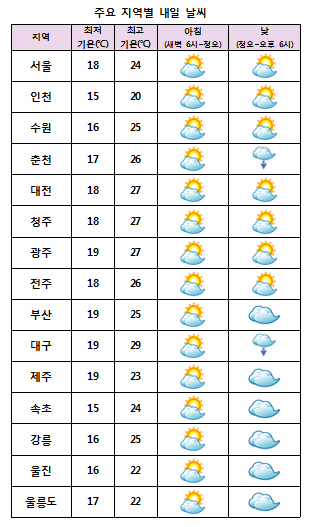 ¾ÆÄ§ ÃÖÀú±â¿ÂÀº 15¡É¿¡¼ 19¡É, ³· ÃÖ°í±â¿ÂÀº 20¡É¿¡¼ 29¡É°¡ µÇ°Ú´Ù. ´çºÐ°£ Æò³â°ú ºñ½ÁÇϰųª Á¶±Ý ³ôÀº ±â¿ÂºÐÆ÷¸¦ º¸À̰ڰí, ³»·úÀ» Áß½ÉÀ¸·Î ³·°ú ¹ãÀÇ ±â¿ÂÂ÷°¡ Å©°Ú´Ù.