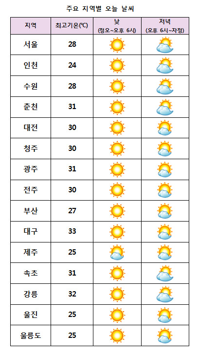 ¿À´Ã ³· ±â¿ÂÀº ¼¿ï 28¡É, ´ëÀü¡¤ÀüÁÖ 30¡É, ºÎ»ê 27¡É µî Àü±¹ÀÌ 24~30¡ÉÀÇ ºÐÆ÷¸¦ º¸À̰ڴÙ.