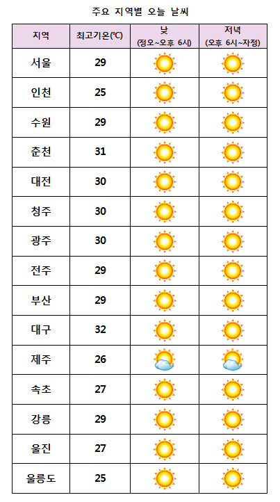 ³· ÃÖ°í±â¿ÂÀº ¼¿ï¡¤ºÎ»ê 29¡É, ´ëÀü¡¤±¤ÁÖ 30¡É, ÀÎõ¡¤¿ï¸ªµµ 25¡É µî Àü±¹ÀÌ 25~32¡ÉÀÇ ºÐÆ÷¸¦ º¸À̰ڴÙ.